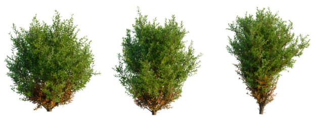 Thuja occidentalis Teddy tree, front view, cutout, transparent background, isolate, Three Cypress Trees with Detailed Foliage and a Touch of Autumnal Color