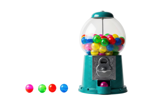 detailed, teal-painted vintage gumball machine with clear glass globe, filled with colorful plastic capsules, set on a transparent surface. concept of nostalgic childhood joy