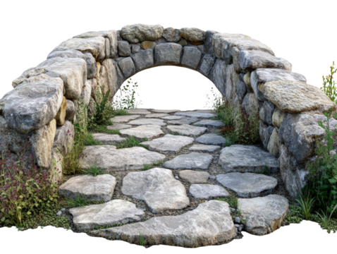 Stone arch bridge with pathway, surrounded by grass, white isolate background