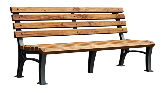 A wooden park bench with a black metal frame, isolated on a transparent background