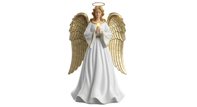 Beautiful stone statue of a female angel with large detailed wings and a golden halo, holding a staff, isolated on a pure white background