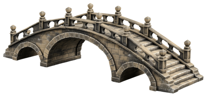 Vintage old arched stone bridge architecture, isolated on a transparent background, representing historical landmarks and travel destinations in towns or cities.