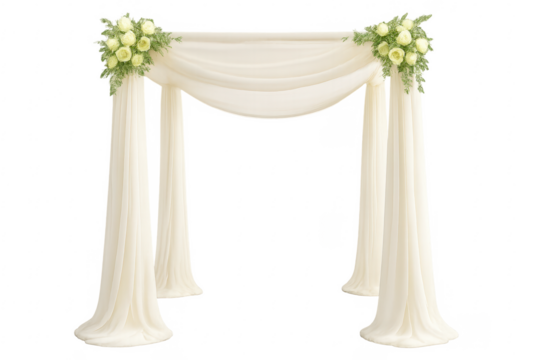 Wedding arch draped with white cloth and decorated with flowers on transparent background