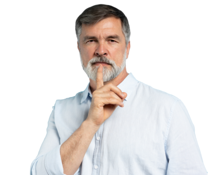 Serious good looking mature male, keeps fore finger on lips, tries to keep conspiracy, looks aside, says: Shh, make silence please. Isolated on transparent