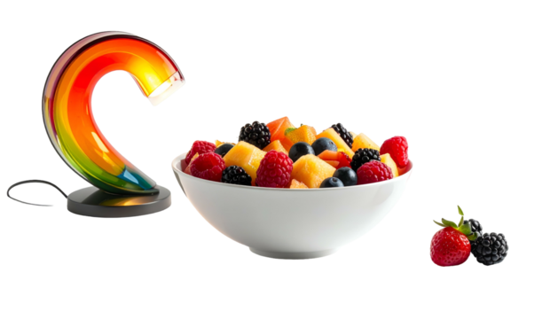 A vibrant fruit salad, illuminated by a colorful arched lamp, sits beside a pair of berries. The composition is set against a black backdrop