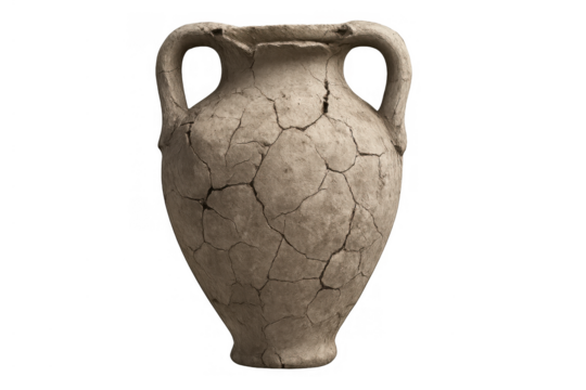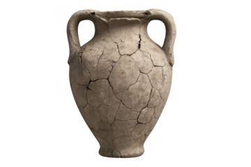 Ancient amphora showing cracked clay texture, symbolizing history, fragility, and archeological discovery on a transparent background