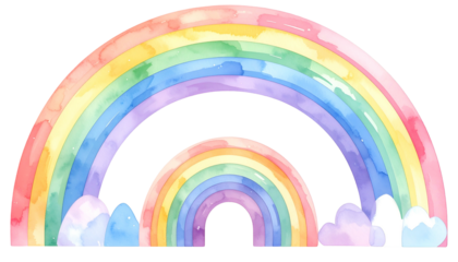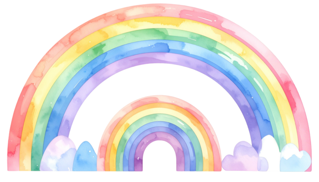 Watercolor illustration of two arched rainbows with clouds, colorful and cheerful