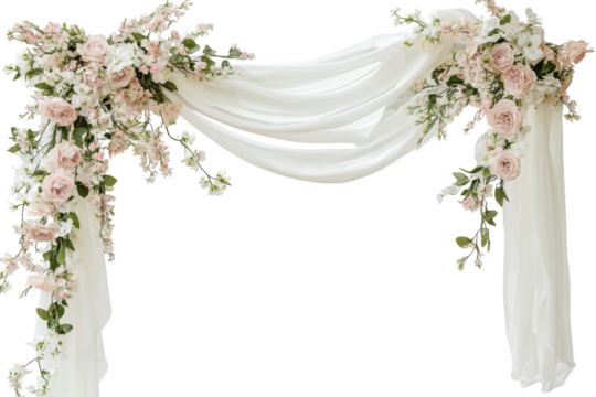 Elegant Floral Wedding Arches with Soft Draped Fabric and Lush Greenery, Perfect for Romantic Ceremony Settings, Isolated on Transparent and White Background