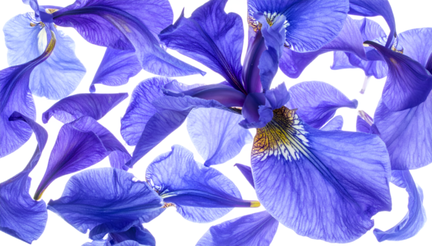 Vibrant blue and purple iris petals scattered beautifully on a crisp white background, creating a stunning floral pattern with delicate textures and rich botanical hues