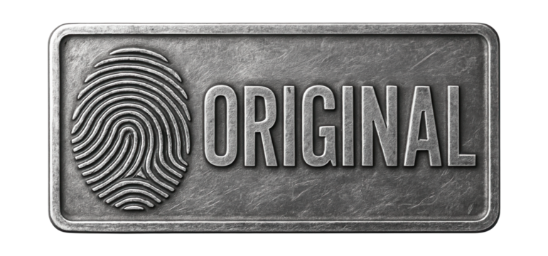 Rectangular metal tag with ORIGINAL engraved beside a fingerprint, featuring an industrial promo style on transparent background.