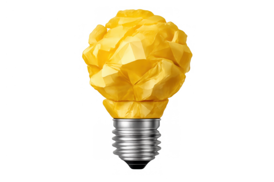Yellow crumpled paper forming a light bulb shape, representing a creative idea, innovation, and problem-solving concept