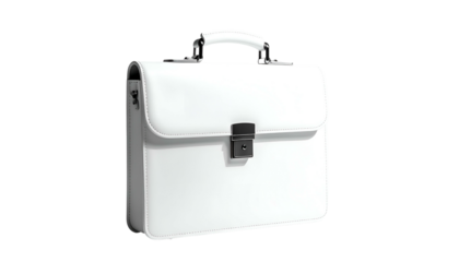 Isolated, pristine white briefcase with silver hardware, handle and clasp, on black background