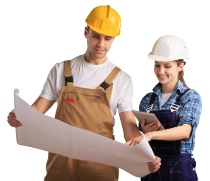 Smiling architect in a hard hat holding blueprints, isolated on white background.