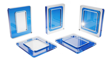 Blue rectangular glass frames arranged in a studio setting showcasing architectural design and product showcasing with a white background