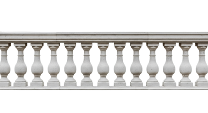 A detailed, close-up, isolated view of a classical, stone balustrade, showcasing intricate carvings and decorative pillars, representing timeless architectural elegance and structure