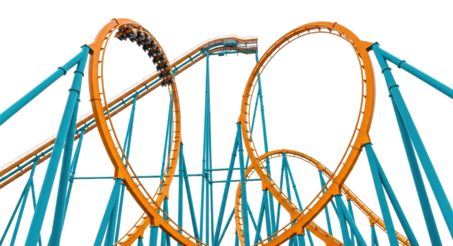 Modern roller coaster, vibrant orange tracks, robust teal supports, large loops, sharp curves, low angle, transparent studio background with copy space, concept of thrill and architectural