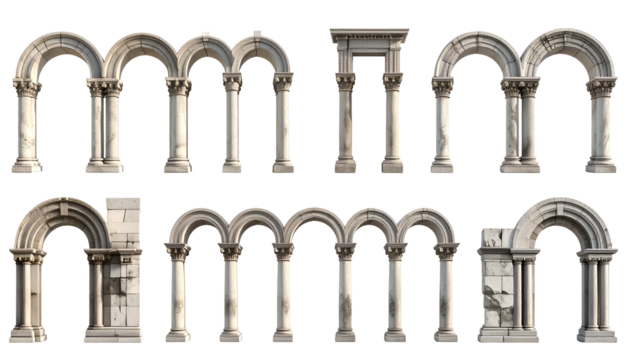Collection of ancient architectural arches in white stone and marble isolated on a black background. 3D render.