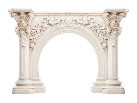 Decorative white stone arch luxury architectural element with floral carvings and columns antique roman style entrance portal vintage building isolated on transparent background