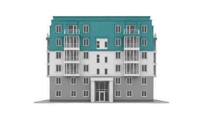 Classic prefabricated green house featuring a welcoming wooden porch, set against a transparent background, ideal for architectural visualization
