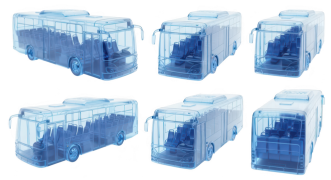 Blue transparent city buses models in multiple views showcasing interior details against a white background for transportation & architectural concepts