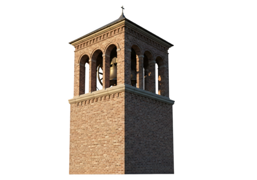 Historic bell tower isolated on transparent background, showcasing the architectural design and brickwork of a traditional campanile structure