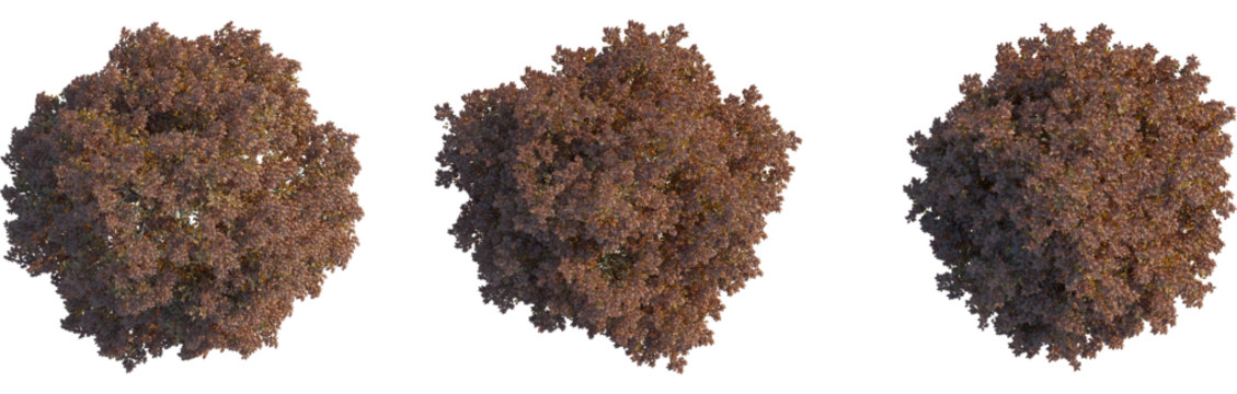 Fagus sylvatica tree plan, top view, cutout, 4k png, isolate, Good for architectural visualization, Three brown bushy tree tops with foliage on transparent background