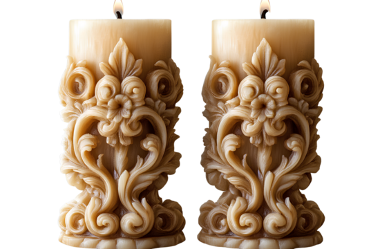 a pair of carved candles with ornate designs, isolated on a transparent background.