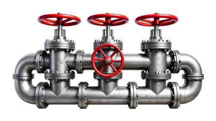 Industrial steel pipes with red valve handles, isolated graphic style on white background, concept of infrastructure and clean layout. Ai generative