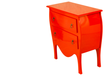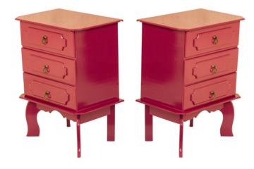 Criado Mudo de cor vermelha, duas gavetas com puxadores de metal. São Paulo, Brasil.