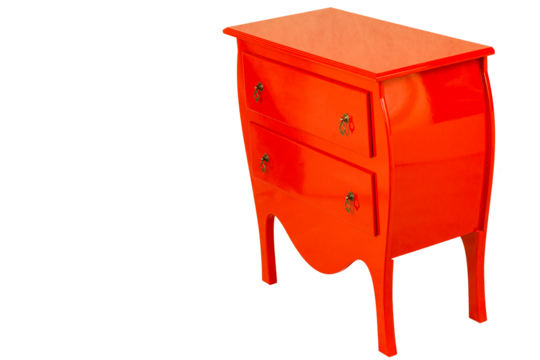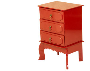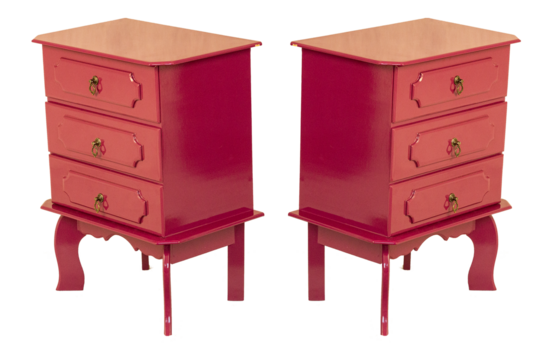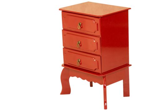 Criado Mudo de cor vermelho, três gavetas com puxadores de metal. São Paulo, Brasil.