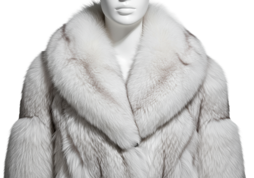 Medium close-up of a luxurious transparent arctic fox fur haute couture coat, emphasizing the ultra-detailed, voluminous deep-pile collar on a transparent background, concept of extreme luxury