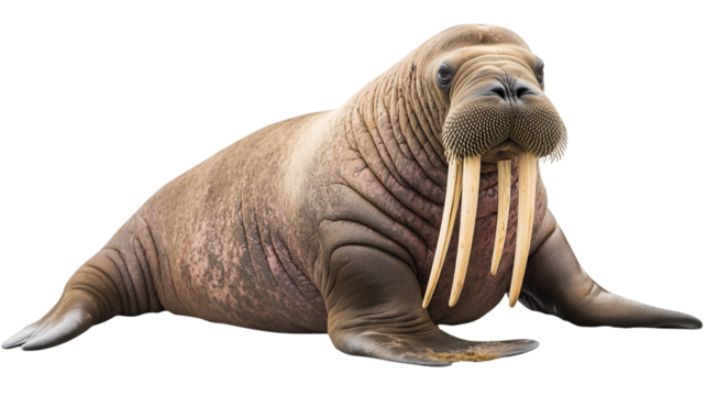 A walrus lying down with its tusks visible against a black background in a studio shot setting