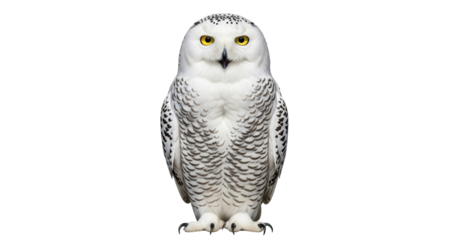 Snowy owl looking directly, a majestic bird of prey with bright yellow eyes and white plumage on transparent background