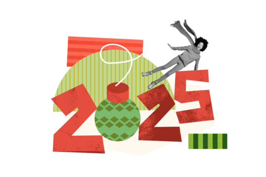 3D collage trend artwork composite sketch poster of winter spirit happy christmas december miniature young woman fly greeting ard ball