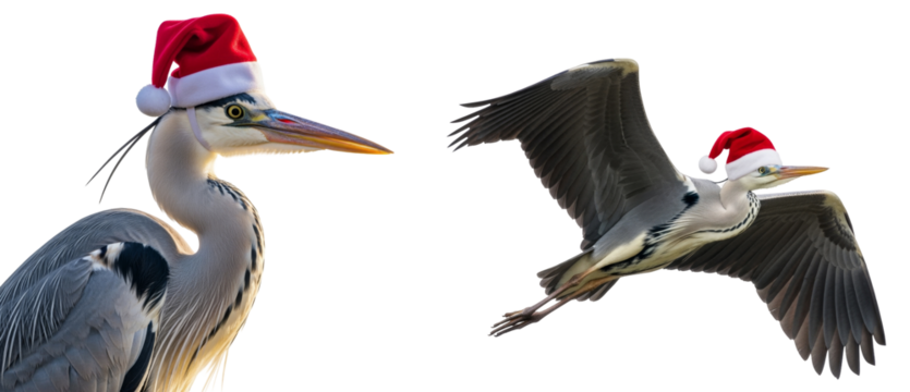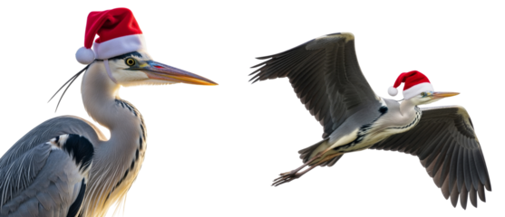 a grey heron (ardea cinerea) wearing a santa hat standing and flying