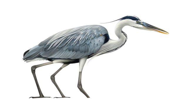 A grey heron standing on a white background