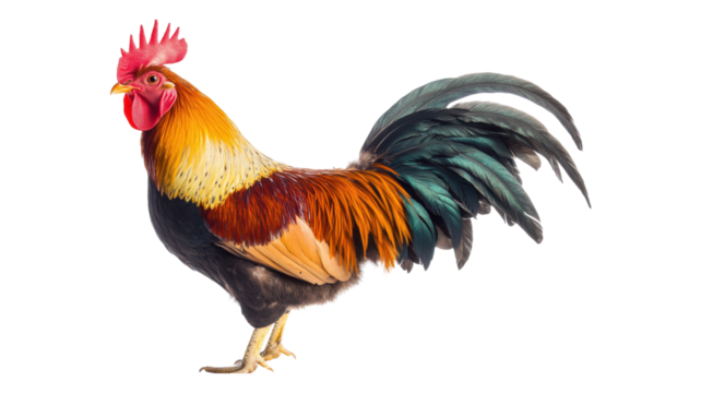 A vibrant rooster with striking plumage displaying its colorful feathers against a neutral background.