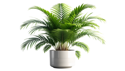 Lush green areca palm plant in a white pot isolated on transparent background
