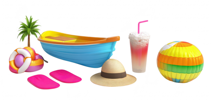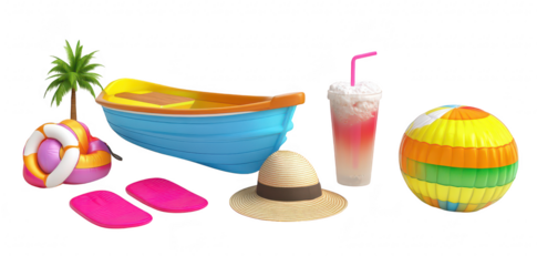 A summer beach scene featuring a colorful boat. inflatable beach ball. refreshing drink. flip-flops. a straw hat. and a palm tree. perfect for evoking vacation vibes and leisure activities