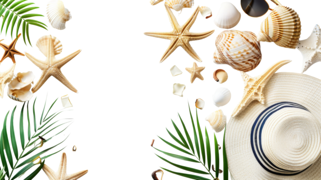 A beach scene featuring a deck chair, palm tree, and straw hat, isolated on white, PNG