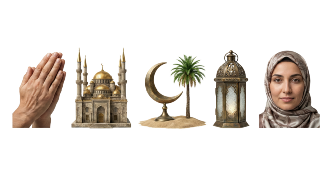 Ramadan Islamic Symbols: Mosque, Crescent Moon, Palm Tree, Lantern, Praying Hands, Woman
