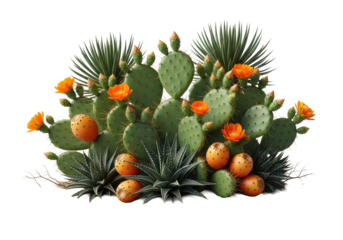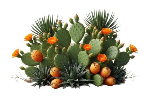 A prominent cluster of vibrant green prickly pear cacti with orange flowers and ripe fruits, intermingled with dark green agaves in sandy desert soil, studio product shot with soft lighting on white