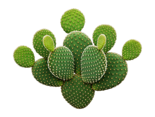 A cluster of green bunny ear prickly pear cactus pads with white glochids, isolated on transparent background