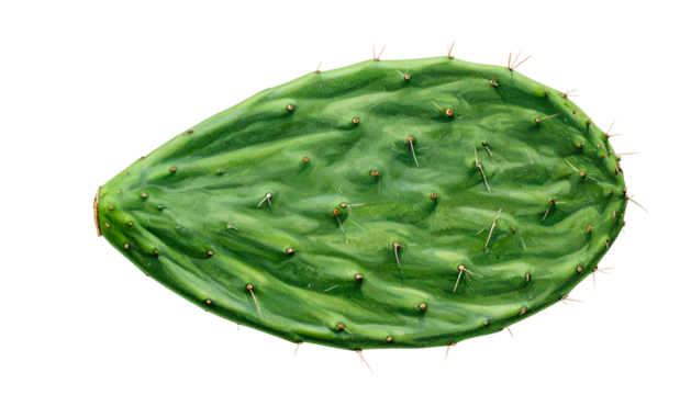 Isolated vibrant green prickly pear cactus pad with brown areoles, ready to cook or eat