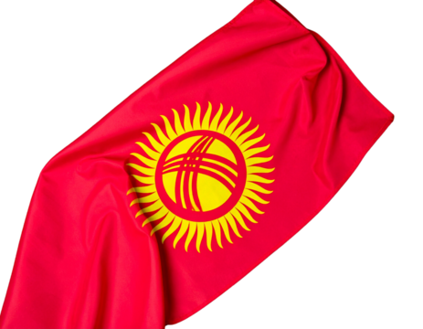 Waving Kyrgyzstan Flag with Yellow Sun and Tunduk Emblem, Side View in Wind, Isolated PNG.