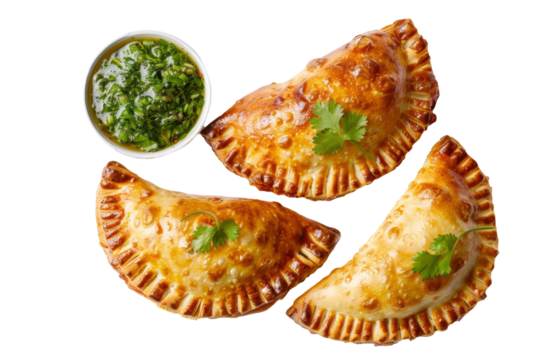Argentinian empanadas with flaky pastry filled with savory fillings such as beef, chicken, or cheese, served with chimichurri sauce.