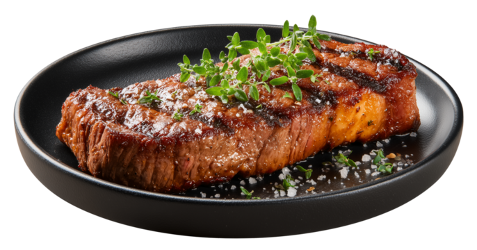argentinian steak with herbs on a matte black plate with grilled texture and warm juicy presentation