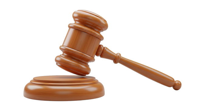 Wooden judge's gavel symbolizing law, justice, verdict, and authority, isolated on transparent background