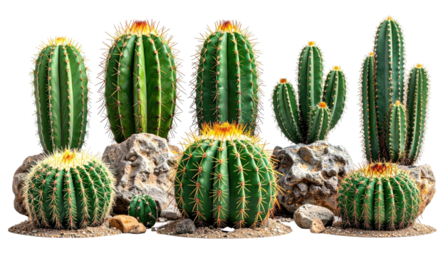 A vibrant collection of various green cacti, some round and others tall, arranged on rocks and sandy soil