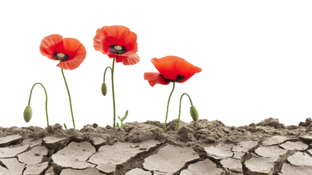 Red poppies growing in cracked arid soil  isolated on transparent white background